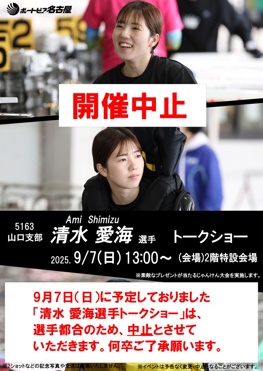 9月7日(日)に予定しておりました「清水 愛海選手トークショー」は、選手都合のため、中止とさせていただきます。何卒ご了承願います。