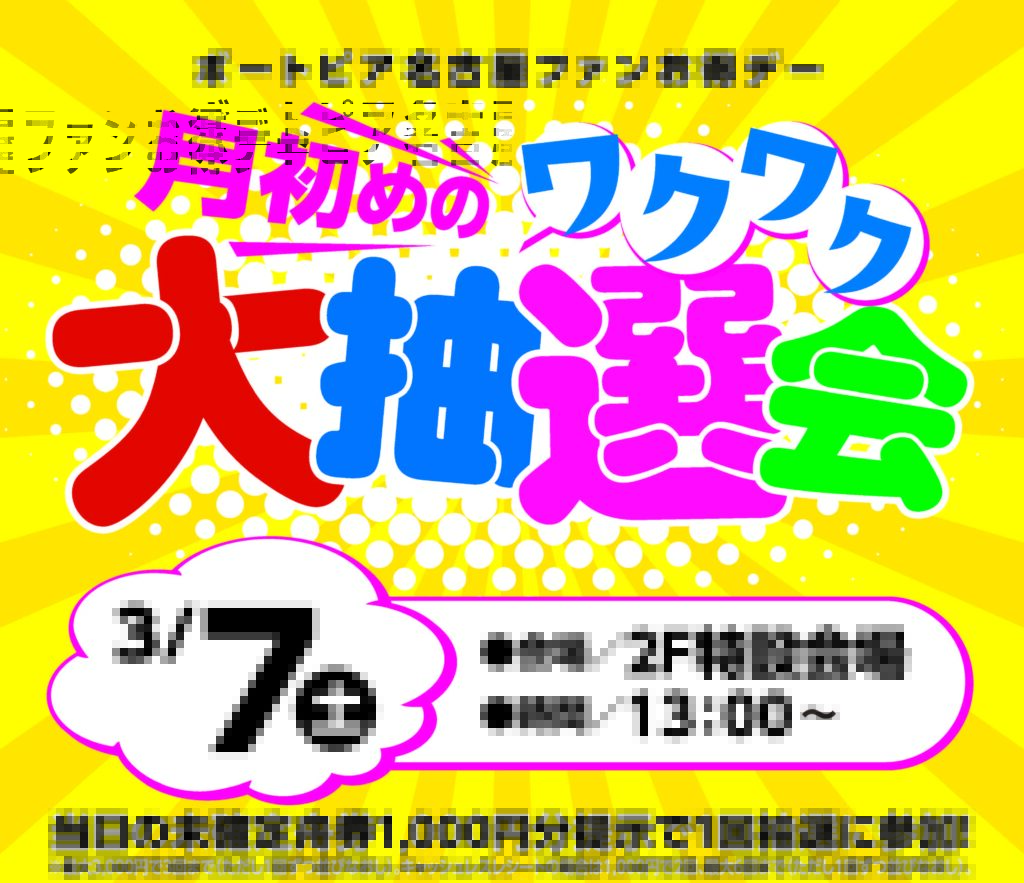 2階特設会場にて、『ボートピア名古屋ファンお得デー 月初めのワクワク大抽選会』を開催いたします! 当日の未確定舟券1,000円分の提示で豪華賞品が当たる抽選会に参加していただけます。 みなさまのご来場をお…