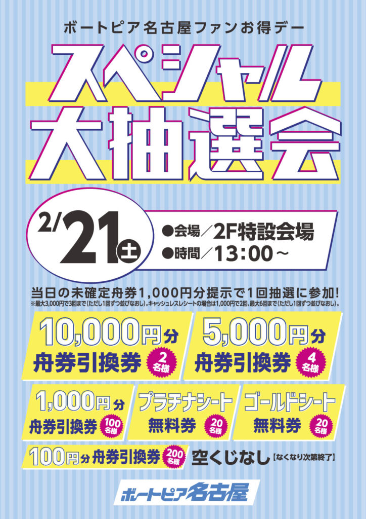 2階特設会場にて、『ボートピア名古屋ファンお得デー スペシャル大抽選会』を開催いたします! 当日の未確定舟券1,000円分の提示で舟券引換券10,000円分などが当たる抽選会に参加していただけます。 みなさまの…