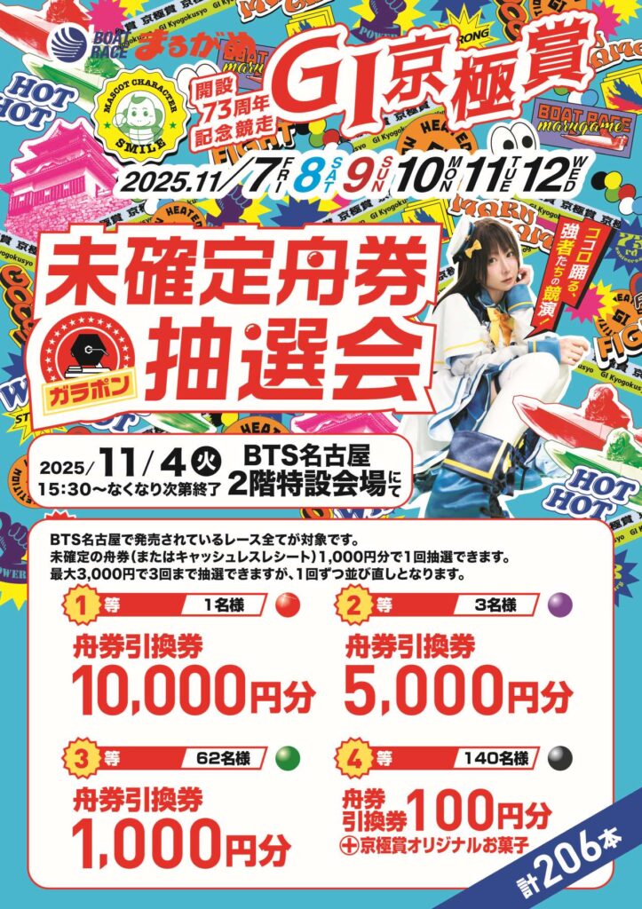 2階特設会場にて、『ボートレースまるがめ GⅠ京極賞PR抽選会』を開催いたします! 当日の未確定舟券1,000円以上の提示で舟券引換券10,000円分などが当たる抽選会に参加していただけます。 みなさまのご来場をお待…